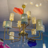 A sculptural chandelier featuring ceramic shades with graphic cut-outs on a warm brass frame.