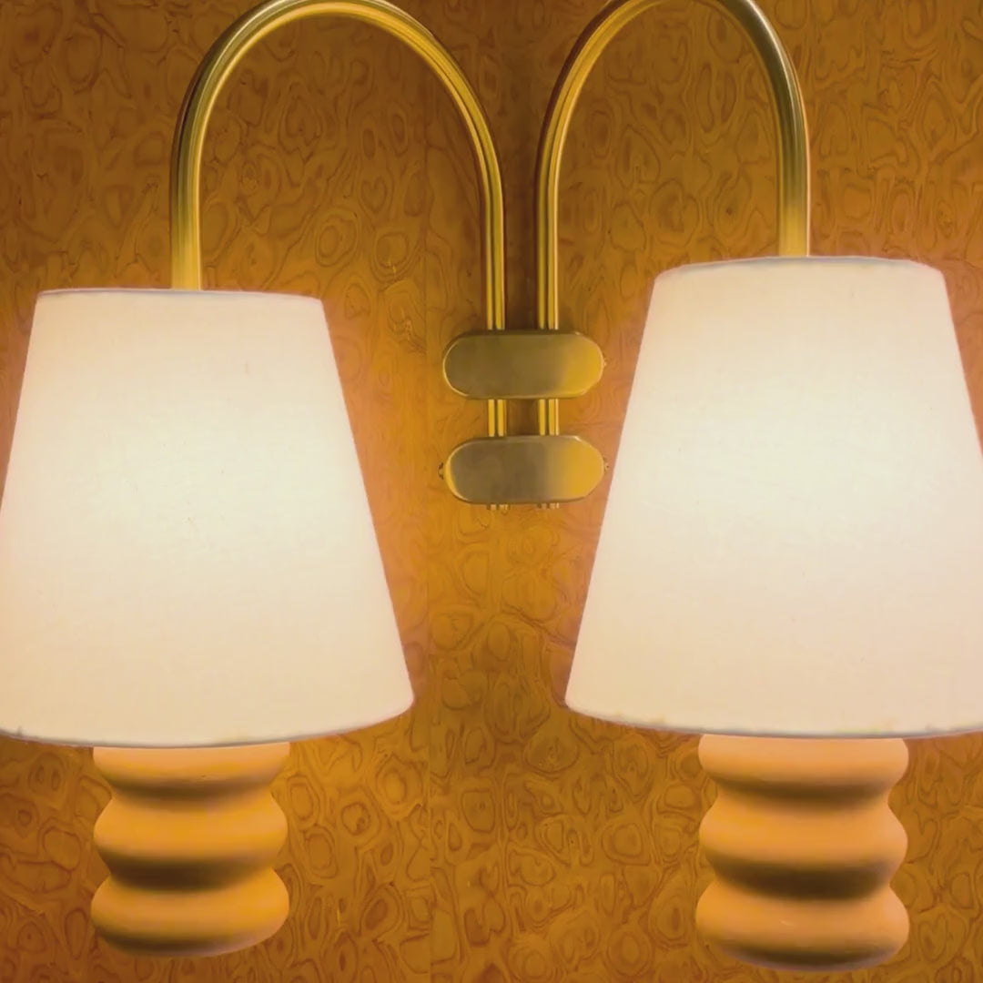This wall light balances ribbed terracotta modules with arched brass arms and conical fabric shades. Sculptural yet refined, it casts diffused illumination that enhances vanity areas or accent walls with warmth and symmetry.