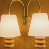 Terracotta modules and brass arms paired with fabric shades for warm, sculptural light.