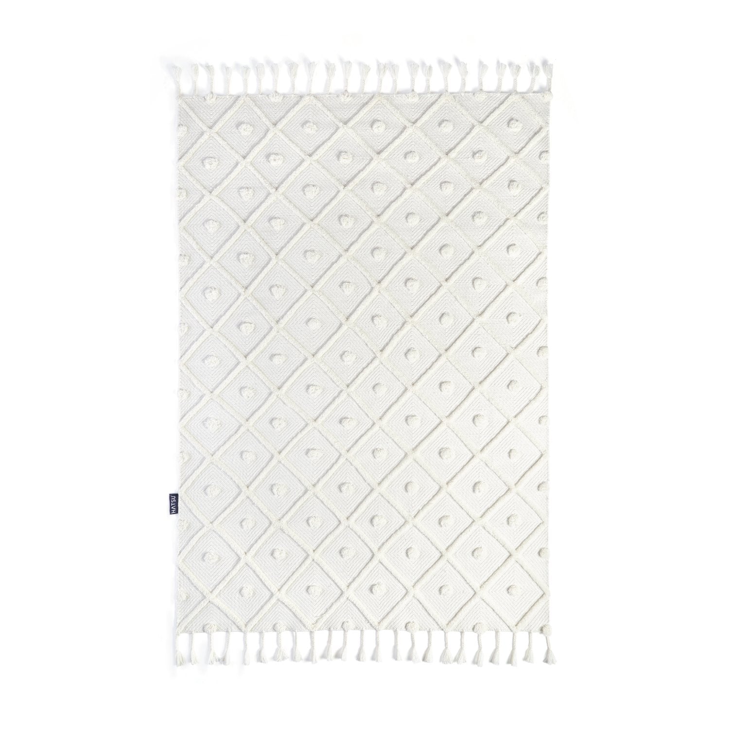 A textured white rug with diamond weaves and tassel edges for a handcrafted charm.